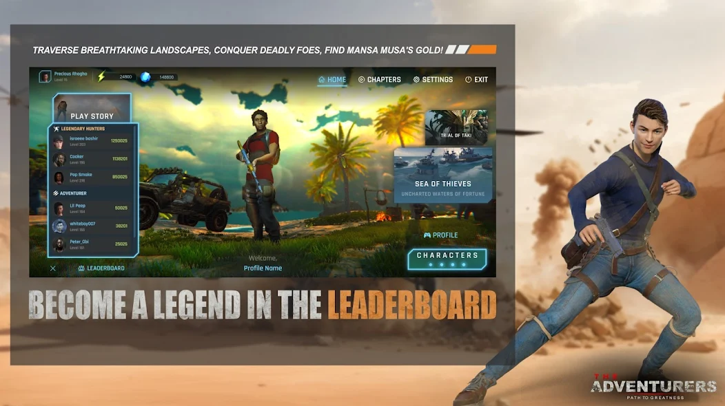 Adventurers: Mobile - a dynamic adventure game featuring elements of shooting, puzzles, and exploration. Embark on an exciting journey through West Africa to uncover the mystery of Mansa Musa's treasure — the legendary richest person in history. You will become a young explorer, eager for fame and adventure, and your journey will take you through ancient ruins, mysterious cities, and exotic locations. Use your agility and cleverness to jump over traps, slide under obstacles, climb to the tops, and swing on ropes. Look for clues, discover hidden artifacts, and upgrade your gear to tackle increasingly challenging trials. Features: Locations around the world, including the Sahara, Egypt, Mali, and Timbuktu Powerful bosses and tough enemies Secret zones and hidden treasures