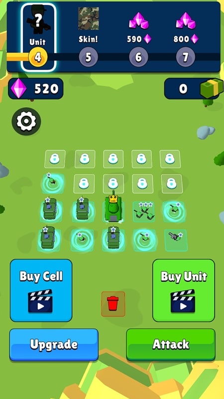 The completely new gameplay of Army Merge: Tank Master will surprise you. You will arrange combat units into empty cells on the screen. With an area of 4×5, there are up to 20 military units deployed at the same time. However, you must buy these empty cells with purple gems to be allowed to use. Will you put infantry units first or armored units first? Their position when participating in the battle is also very important because the enemy will be able to easily deal with you. After arranging the formation, you can fight immediately with the Attack button in the right corner of the screen or choose to upgrade your strength with the Upgrade button.