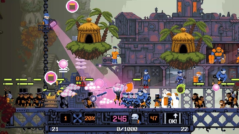 DRAW CHILLY Mod menjatuhkanmu ke kota pasca-pertempuran di mana tujuan utamamu bukan hanya membangun kembali, tapi bertahan dari serangan monyet bersenjata yang tak henti-hentinya. Inti permainannya adalah gabungan panik antara mengumpulkan sumber daya, pertarungan slapstick, dan perluasan markas, dibungkus dengan gaya seni 2D unik yang terasa seperti mimpi demam antara game beat-'em-up arcade klasik dan simulasi manajemen. Kamu terus-menerus harus memilih antara mengetuk untuk sumber daya, menghindari proyektil yang datang, dan memanggil penunggang kuda apokaliptikmu untuk mengubah keadaan, menciptakan ritme yang uniknya stres tapi memuaskan.