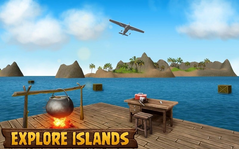 O Ocean Survival Mod cria seu nicho no gênero de sobrevivência mobile ao focar intensamente no isolamento marítimo. Seu mundo inteiro é sua jangada. Você começa com um simples anzol, que usa para lançar e recolher detritos flutuantes — tábuas, folhas de palmeira, barris e ocasionais preciosos pedaços de metal. Este saque não é apenas enchimento de inventário; são literalmente os blocos de construção da sua sobrevivência. Você os usará para criar ferramentas, expandir sua jangada peça por peça, construir coletores de água e, eventualmente, forjar armas para se defender da ameaça sempre presente dos tubarões. O jogo se destaca com seus visuais 3D limpos e um ciclo palpável de dia/noite e clima que realmente afeta a jogabilidade, tornando as tempestades um perigo genuíno para sua frágil casa flutuante.